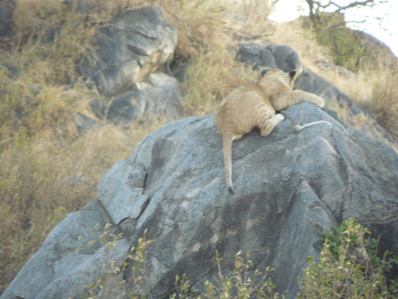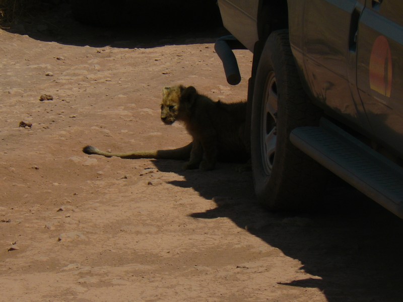 The second night was another matterΒ entirely. We used the toilet early, after checking for lions of course. I had a mental image of opening the washroom door only to see a lion perched on the squat toilet. This stuck me as hysterically funny, which should give you some idea of my mental status at the time. I fell into bed at about 9:30 p.m. At 10:00 p.m., I was startled awake by shouts of “Simba! Simba! Simba!” Our feline friends had returned and scared the poor men filling the water tank. I overheard our driver, Alex, shout “There are so many of them!” and “Look at the cubs!” I opened my tent to see what the fuss was about, and I saw that everyone who had still been outside was now in the truck shining their flashlights out the window. Alex yelled “Stay in your tents! Stay in your tents!” I quickly zipped up the tent, feeling slightly cheated that I didn’t see the cubs and starting to need to go to the bathroom. No chance of that now! I found out the next day that as I opened my tent, a lion had been just a few metres away.