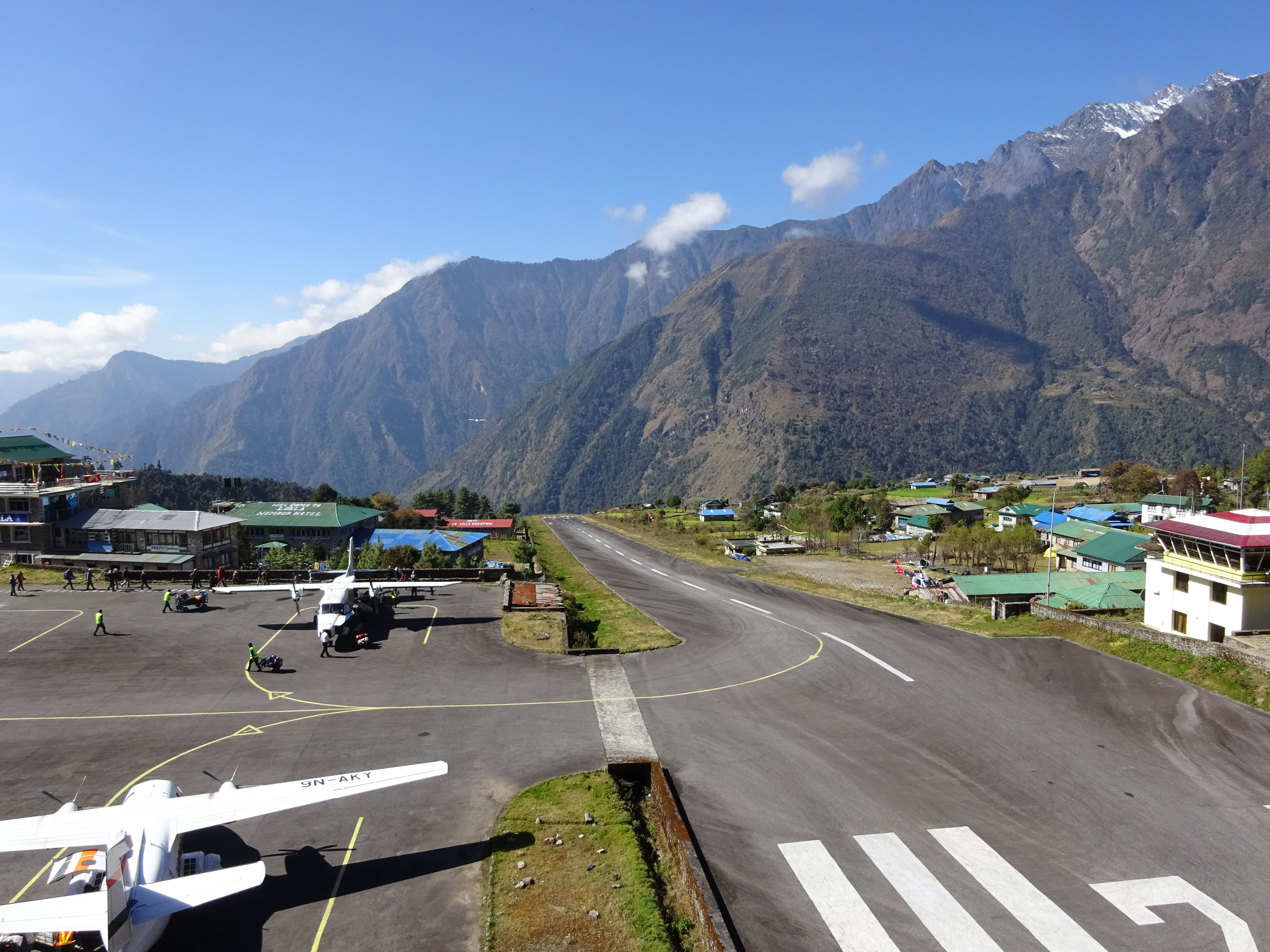 We woke up at dark thirty to catch our flight to Lukla, home of the world’s scariest airport! If you think the international terminal at the Kathmandu airport is a zoo, wait until you see the domestic terminal. It was a nightmare of delays, shouting, frenzied bag-weighing, repeated friskings, and hurry-up-and-waits. I was so happy that our guide was doing virtually everything for us, and we only had to follow instructions. It would be tricky navigating that place on my own.