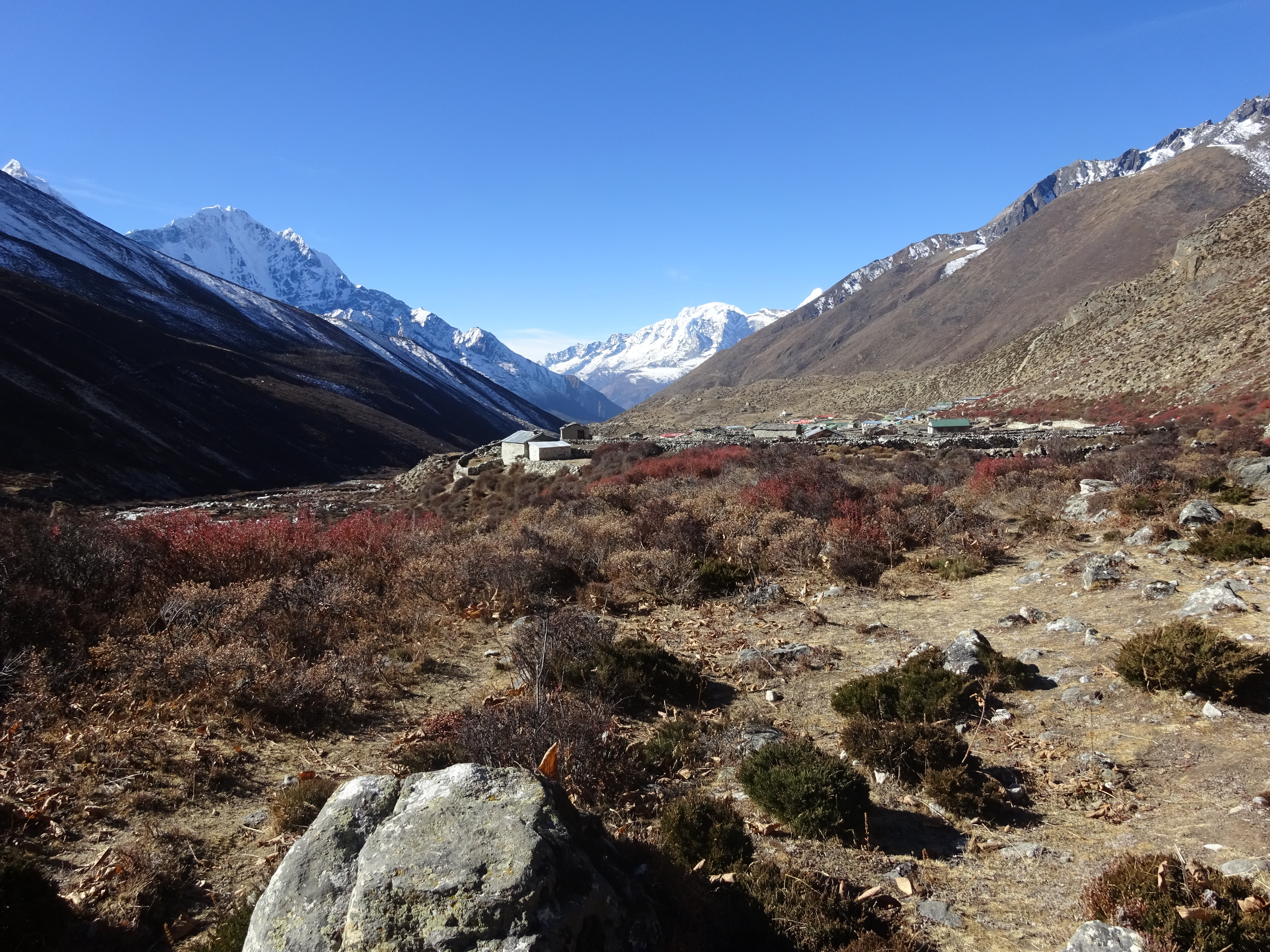 We arrived in Dingboche (4,300 m) that afternoon, and trekked to our teahouse at the very top (of course!) of the village. I optimistically ordered a huge dinner that night (soup, momos and bread), and ate almost none of it. A headache also started setting in. I was just beginning to consider my options for painkillers when a doctor came by our table looking for recruits for a double-blind study on the use of ibuprofen vs. acetaminophen to treat altitude sickness. Perfect timing! I agreed to do the study, and was given a baggie filled with pills that were either ibuprofen or acetaminophen (or maybe a placebo!) They also took my pulse oximetry level (81 – not bad for the altitude). My headache went away fairly quickly, so whatever they gave me worked!