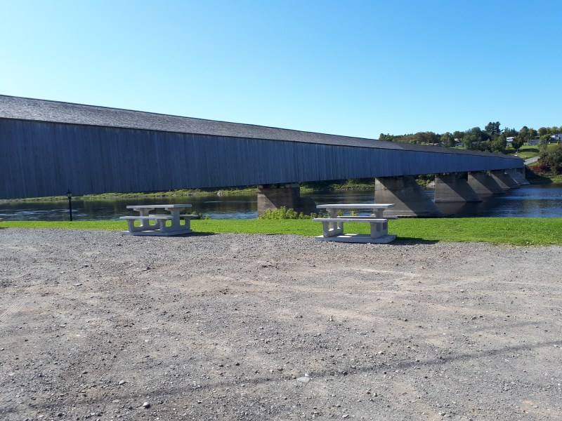 After a cozy night in Shediac, we retraced our steps from the previous week and drove back through New Brunswick. We had an easier pace, since we were only driving as far as Quebec. We stopped in the town of Hartland, New Brunswick, home to the world’s longest covered bridge. I remember taking a picture in front of the bridge on my 2002 trip out east, but our bus couldn’t fit under the arch. This time, we were able to drive on the bridge and into the town, where we enjoyed a tasty lunch before heading back to the highway.