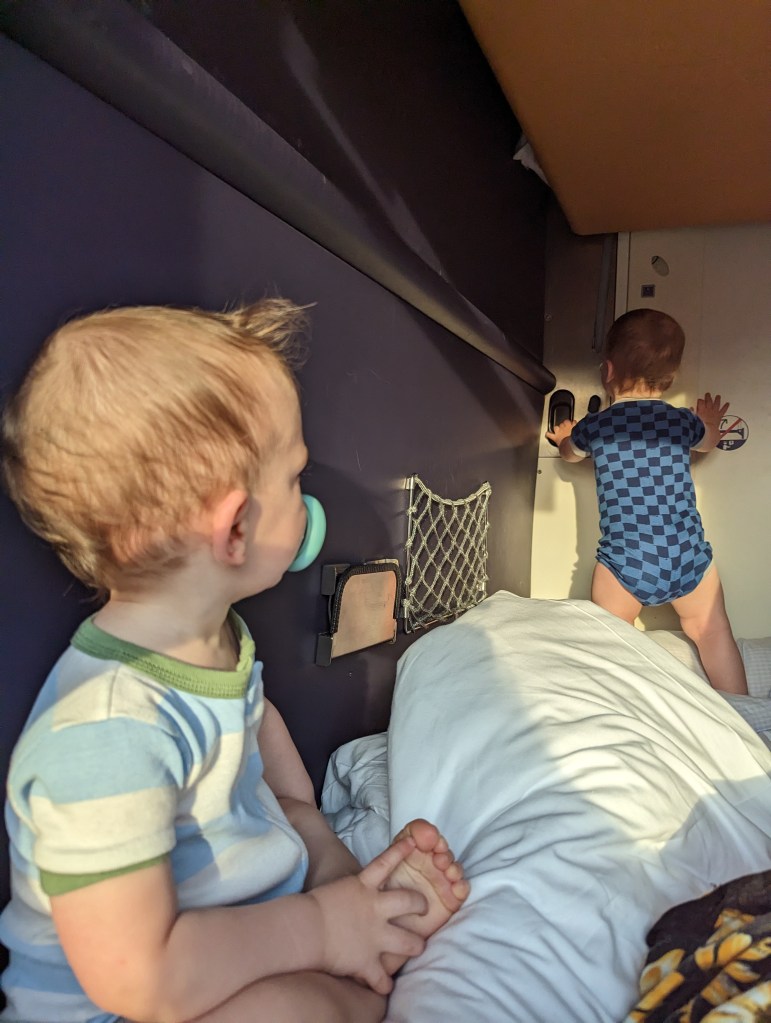 After the attendant set up our bunk bed, we played a stressful game of bag Tetris while trying to keep the boys from repeatedly falling off the bottom bunk as the train rocked and rolled. Once we were more or less organized, we changed the boys into their pyjamas and gave them their night bottles. We did our best to keep some semblance of a bedtime routine. The air conditioning in our toasty little compartment only worked on the top bunk, where Chris slept. The boys had to sleep with me on the bottom bunk, since it wasn’t safe for them on top. Ian conked out almost right away, sticking his little bum bum in the air. Eric spent about an hour crawling up and down the bunk, jiggling everything that could be jiggled, and trying to climb all over his sleeping brother. He finally passed out at an awkward angle across the bed. I started looking for a way to contort myself in a sleeping position around both boys. I had just gotten somewhat comfortable when there was a loud knock at the door. A police officer opened the door and shined a light on us, asking who was in the compartment. I told the officer it was just us and two babies, and he said okay and left. By some miracle, the boys stayed asleep.