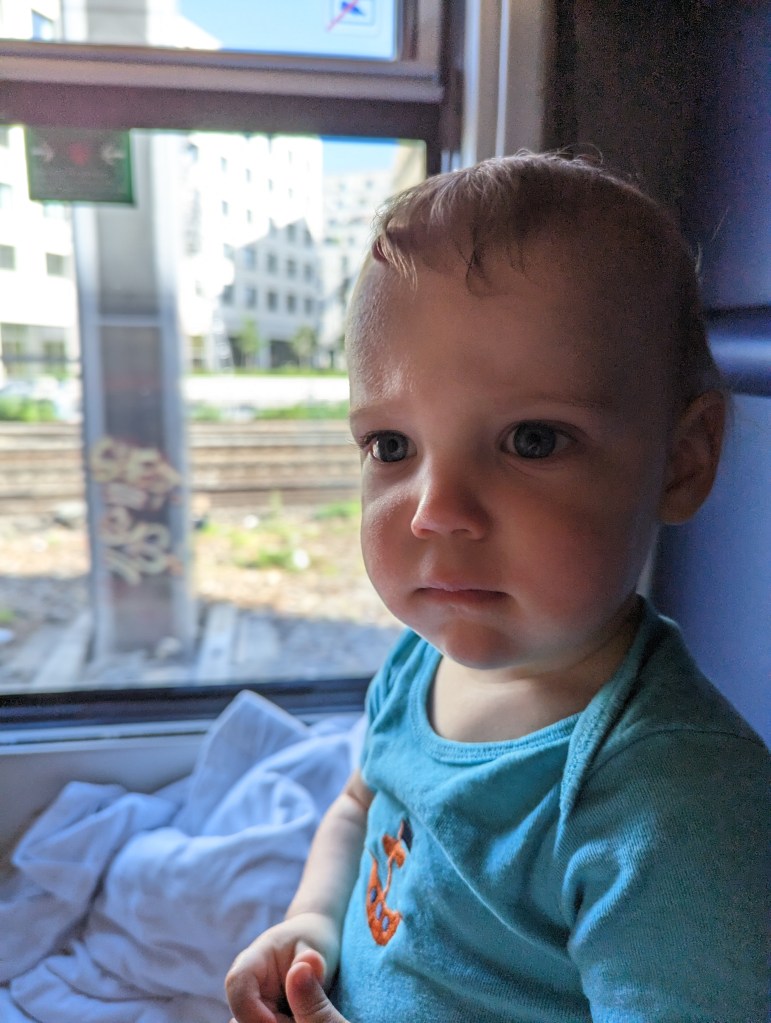The train trip from Hradčovice to Staré Město and then on to Vienna went much more smoothly than the journey in. There were no frantic transfers this time, which made a huge difference. We enjoyed a tasty dinner at a restaurant near the train station and a relaxing play session at a nearby park. Then it was time to board the night train, which was a whole gong show of a process. It’s one thing to board a train with a single suitcase and a carry on, but another thing entirely to board with two big suitcases, one massive bag full of baby Bjorn cribs and blackout tents, a duffel bag jammed with baby stuff, two backpacks, a diaper bag, a lunch bag that fell out of the duffel, two strollers, and two confused and screaming babies. We had only a few minutes, because trains actually seem to run on schedule in Vienna. With Děda’s help, we managed to heave everything onto the train, hop on board, and then jam everything and everyone into the private compartment that Chris and I were sharing with the boys. Děda joined Babi and Tony’s family in a sleeper compartment in a different wagon. Chris and I were alone with our mountain of stuff and our still-screaming babies.