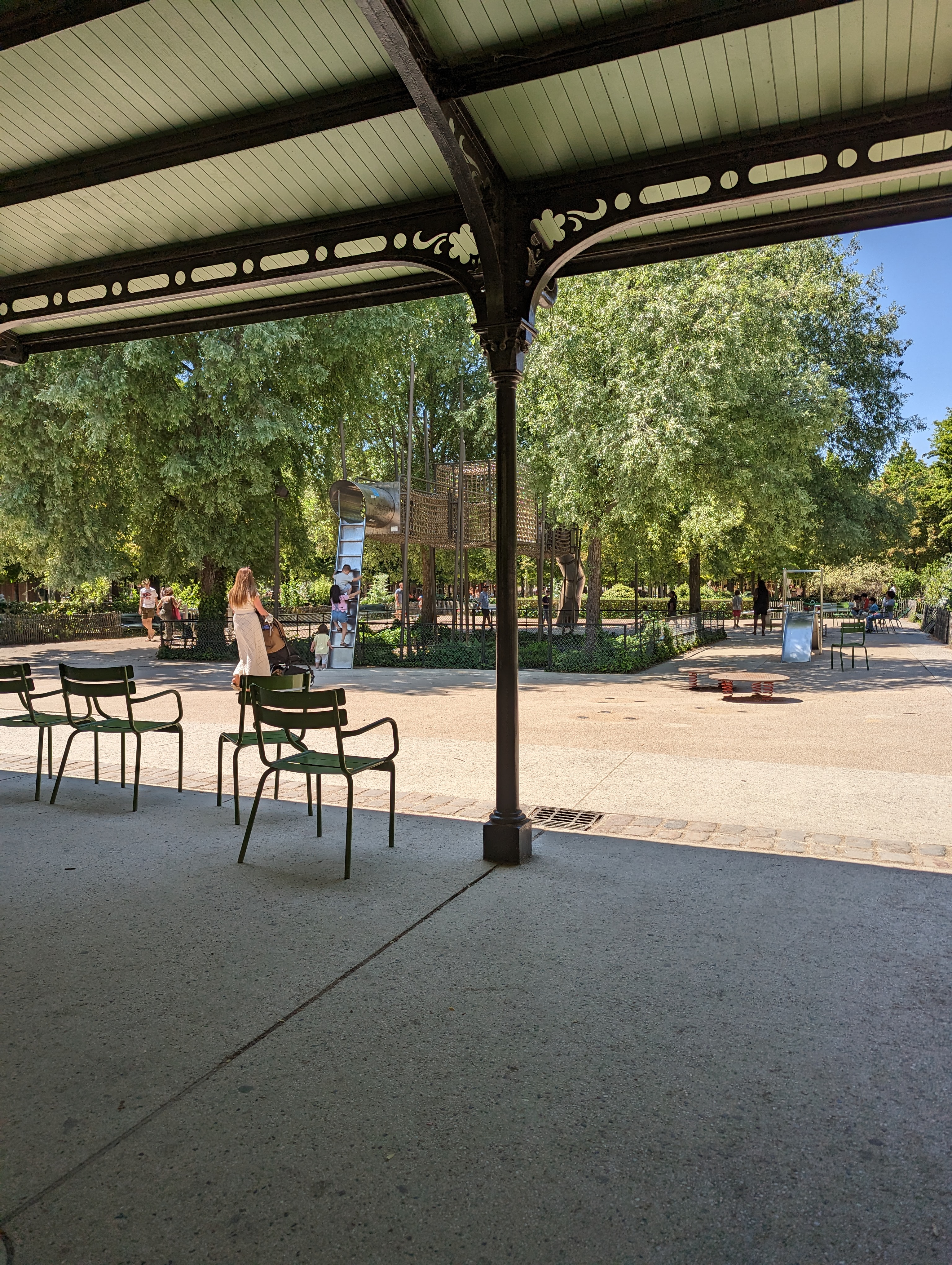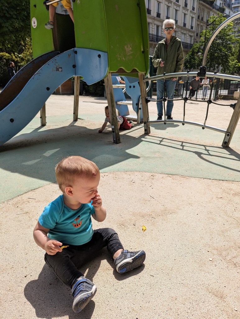 We spent a few hours at a playground near our Airbnb, since we couldn’t check in right away. Eric and Ian crawled around on the ground and put stone after stone in their mouths. The boys were at an awkward stage for travelling to Paris. They were too wiggly to sit contentedly in their strollers and stare at everything, but they weren’t yet full-time bipeds. Parisian parks generally don’t have grass, or at least grass that you’re allowed to sit on. This made it tricky to find them nice places to roam about. On the plus side, there was a lovely creperie next to the playground, where I changed three diapers in half an hour on the reasonably clean floor beside the toilet.