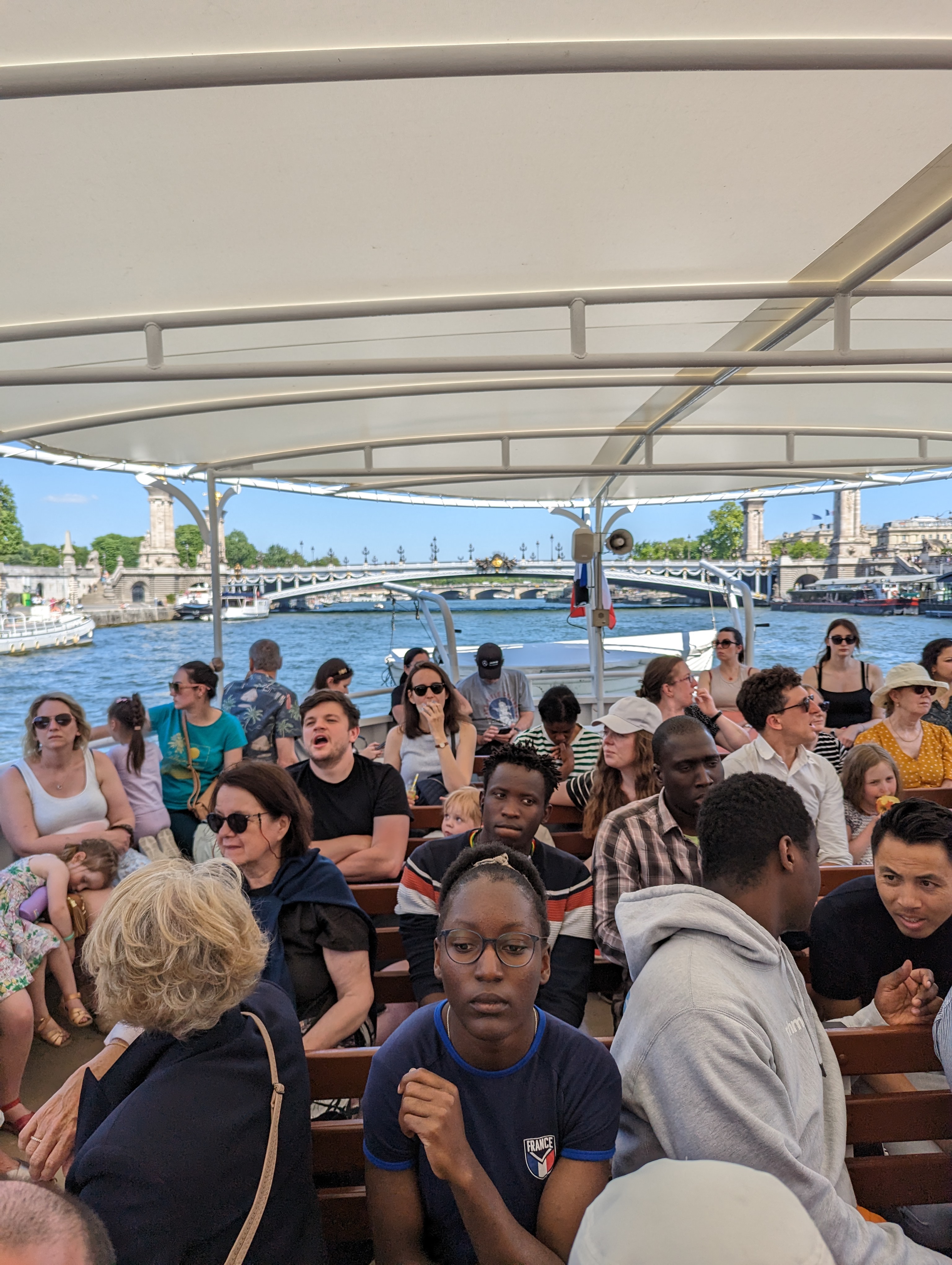 Next on the agenda was a boat ride along the Seine. Virginie kindly bought us all tickets, and we boarded the bateaux mouches. When Virginie proposed this idea, I thought the boys might sit happily on our laps and take in the scenery. Well, they sat happily for about three minutes. They then spent the rest of the boat ride crawling around on the dirty floor, climbing up and down and up and down and up and down the stairs, and putting anything they could find into their mouths. I had to stop them repeatedly from trying to crawl through the portholes that led to the Seine and from mouthing the scooter parked beside their strollers. I don’t think either Chris or I saw a bit of the city. The rest of my family, however, had a swell time.