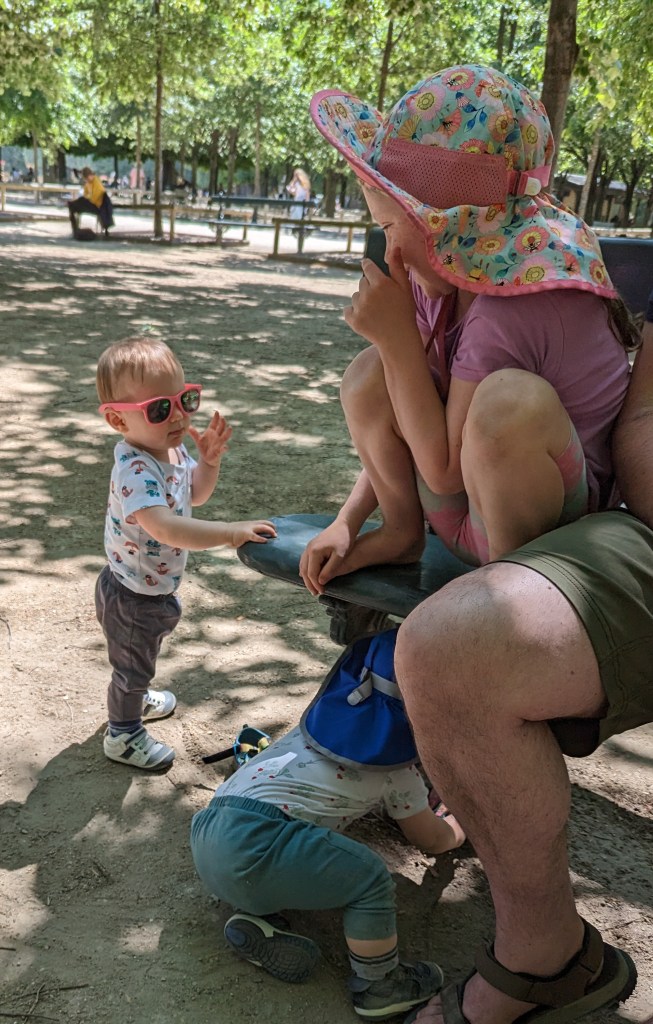 The next day, we joined Tony’s family at the Luxembourg Gardens after the boys’ morning nap. I had some vague memory of grass at the gardens, so I thought the boys could crawl on that. There is indeed grass, but it’s blocked off. Once again, the boys got covered in a fine layer of Parisian dust. At least there was lots of shade. We managed to take a family photo of Babi and Děda with all their grandchildren in front of the Medici Fountain. Nobody cried and everyone more or less looked in the direction of the camera. Woohoo!